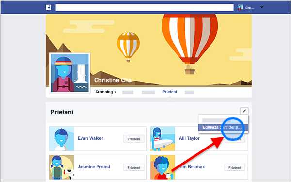 Selectaţi opţiunea Editează confidenţialitatea aflată în meniul din colţul din dreapta sus al secţiunii "Prieteni"