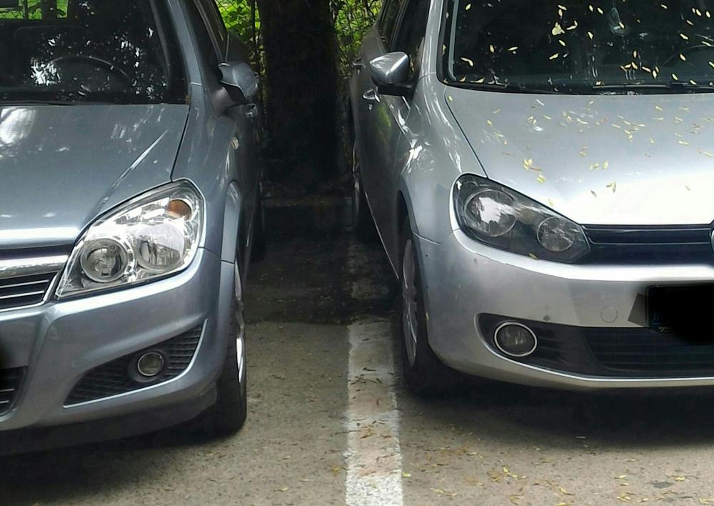 Bună ziua, de cateva zeci de zile ma confrunt cu o situatie pe care nu știu cum să o abordez. In fiecare seară când ajung la parcarea de reședință ( e vorba de o parcare al unui imobil de 7 etaje), observ cu stupoare ca odată parcat, nu am loc sa cobor din mașină, întrucât vecinul meu nu se poate abține din a parca pe linia care desparte locurile de parcare(linia a fost vopsita de catre autoritati, după ce au făcut măsurători). I am explicat civilizat că nu pot sa ies din masina fara sa-i sterg masina si se pare ca nu am cu cine sa ma inteleg.  In imaginea atașată, este vorba de respectivul golf gri, aici se vede cum parcheaza cu roata pe linie (asta e asa parfum, se poate si mai rau). Din cauza acestuia, ca sa pot iesi din masina (chinuit rău), trebuie sa ma apropii de celălalt vecin. Poate părea banal, dar credeti ma ca nu e placut ca in fiecare seara sa fac manevre suplimentare, ca sa ma strecor in locul de parcare, fara sa zgarii masina vecinilor ( in mod ironic, daca i as atingeo ar face spume ca vezi doamne am făcut accident si trebuie făcuta amiabila) si sa stau să i sterg masina de praf , murdarindu mi hainele zilnic. Crede ti ma, spatiul din poza nu e suficient, camera face sa para asa. Eu din cate stiu, parcarea se face intre linii.