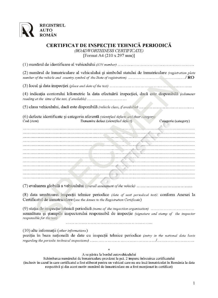 Model Certificat de Inspecţie Tehnică Periodică